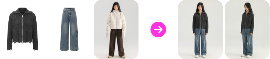 Tips.Upload up to 3 garment images to create an outfit. Batch uploads are not supported.